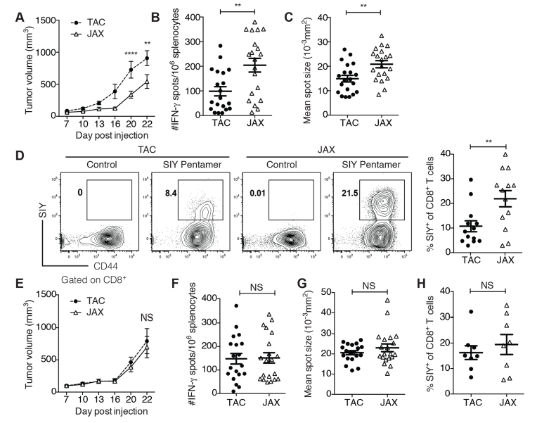实体瘤的T细胞浸润与良好的病人预后密切相关,但个体间多变的免疫应答机制尚未阐明,肠道菌群可能是其中有效的调制器。研究发现,JAX小鼠往往对移植到皮肤下的黑色素瘤产生强有力的自发性免疫应答,而TAC小鼠则显示较弱的应答现象。