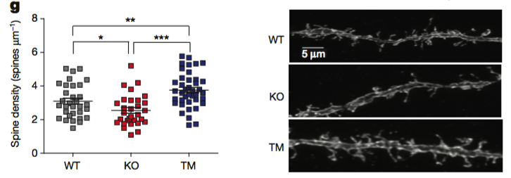 前期研究表明,Shank3会导致总脊柱密度的变化,后期Shank3的表达是否也会影响脊柱结构呢?GFP标记观察背侧纹状体树突棘结果显示,KO组中型多棘神经元显著减少,而TM组总脊柱密度显著增多,首次揭示Shank3促进脊柱形成的功能不限于发育关键期。