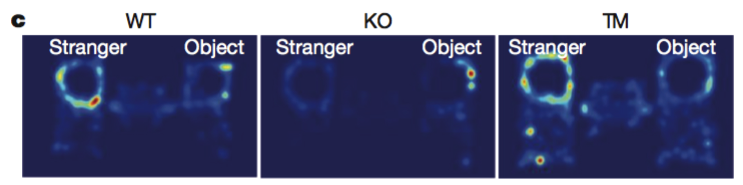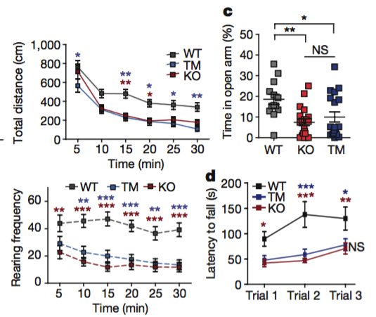 自闭症的特点之一是社交互动的减少,研究人员采用三室检测进行研究。结果显示,KO鼠不喜与陌生小鼠交流,但是TM鼠却有着和WT鼠一样的表现-喜欢和陌生鼠互动。说明社交修复即使在成年期也可以发生。遗憾的是,Shank3修复对运动减少,焦虑,运动协调能力减弱并无较大修复作用。