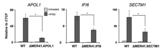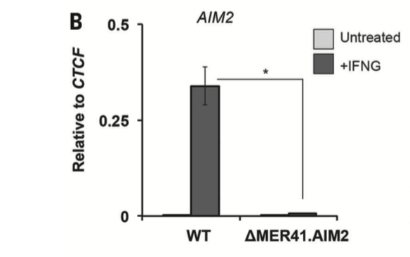 研究人员利用CRISPR-Cas9系统敲除ERVs相关基因MER41。当促炎性因子IFNG刺激细胞时,细胞中关键的免疫调节基因AIM失去了作用。AIM促进细胞炎性小体的组装合成。