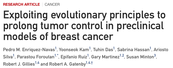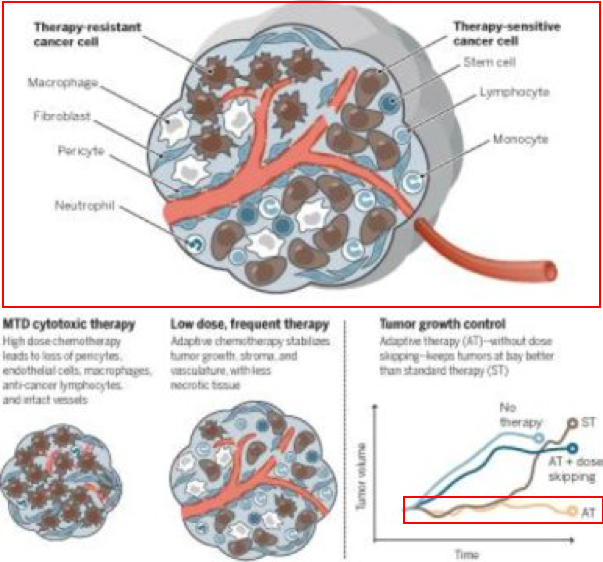 考虑到肿瘤组织的进化导致耐药细胞大量产生,Pedro Enriquez-Navas等人设计了一个基于进化学的治疗策略,根据肿瘤的反应调整药物剂量,即自适应疗法(adaptive therapy),通过维持少量化疗敏感肿瘤细胞抑制耐药细胞的生长,从而使肿瘤得到稳定控制。