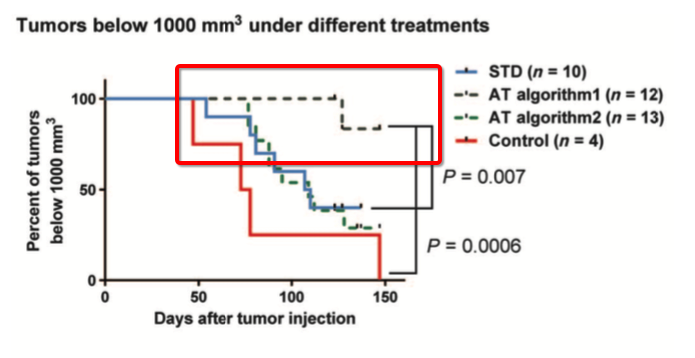 3.相比之下,自适应治疗在初始使用高剂量药物,随后根据肿瘤的反应逐步降低剂量对肿瘤的控制更加有效。这种疗法使60%-80%的小鼠在完全不用药物的情况下在相当长一段时间内没有复发。