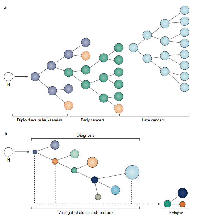肿瘤克隆进化模型(clonal evolution model)的发现,是癌症研究一个划时代的里程碑。这个模型的建立,将癌症研究推向了动态的过程。简单来说,肿瘤克隆进化模型认为,肿瘤起源于正常细 胞,细胞突变产生了异常的后代,后代细胞又发生突变形成了大量的变异肿瘤细胞。(下图a)