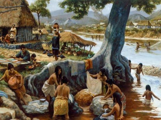 想象图:一个古代玛雅人村落的日常生活(图片来源:H. Tom Hall, National Geographic)