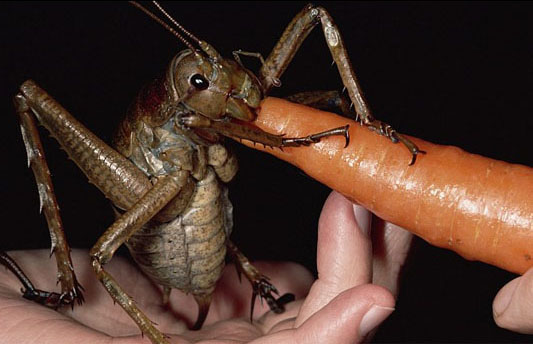 在发现这只巨沙螽后,马克喂给它一个胡萝卜。马克说:“我们三人在这个小岛上搜寻了两个晚上,一无所获。但我突然在一棵树上看到了它。巨沙螽是世界上最大的昆虫,而这只是巨沙螽中最大的一只,它相当于三只老鼠的重量。它很喜欢吃胡萝卜,为此甚至不介意站在我手上品尝美味。这种巨沙螽是一种濒危物种,我们在给它拍照后,又将它送回原地。”