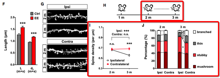研究人员利用光遗传学手段激活单个树突棘,和相邻未激活树突棘进行比较,结果发现树突棘的修剪和两个树突棘之间的物理距离以及cadherin/catenin复合物在两个树突棘之间的分布相关。两个树突棘对cadherin/catenin复合体存在竞争关系。