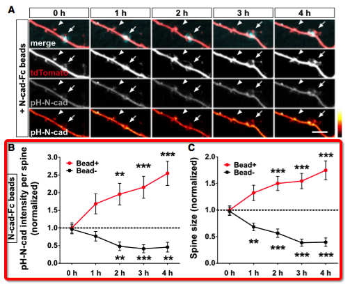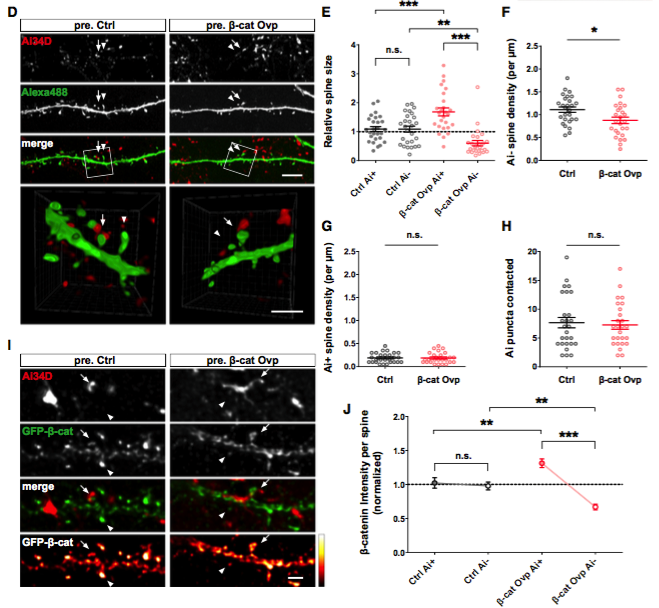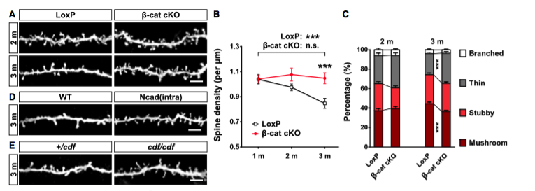 2011年研究人员聚焦cadherin/catenin,他们发现cadherin/catenin相对富集的树突棘,其体积较大,而相邻的树突棘较小,或消失。此次,研究人员利用条件敲除技术,敲除小鼠大脑皮层以及海马体神经元的β-catenin,敲除鼠神经元树突棘密度显著上升,成熟树突棘水平下降。除此之外,过表达N-cad劫持β-catenin功能或是敲除αN-catenin基因,神经元树突棘修剪以及成熟同样被抑制。
