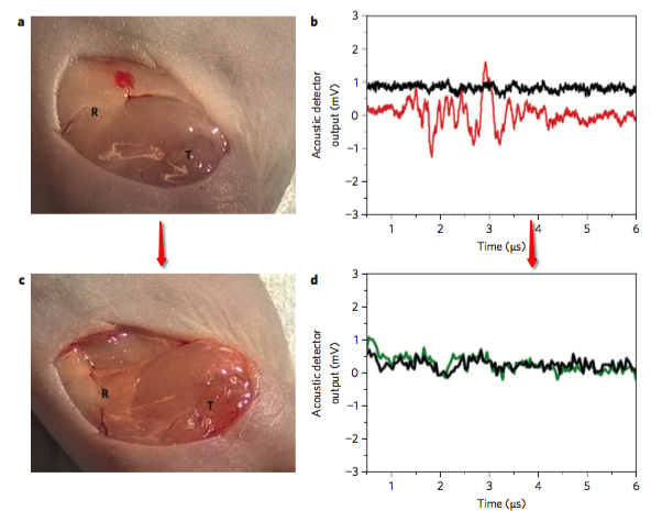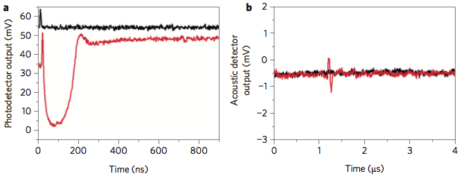 当时的研究是基于体外细胞实验。细胞内的胶体金团簇,以高于其激发阈值能量的激光脉冲(782nm,30ps,10-15mJ cm-2)激发,产生的泡泡以声学方式能够被检测到。(如图红色线、黑色线为对照)