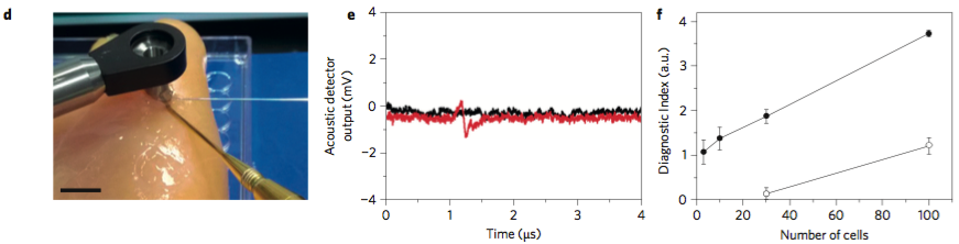 本研究中,研究人员将这种技术延伸到固体组织中。研究人员将胶体金预处理的肿瘤注射到鸡胸肉中,利用内窥镜发射激光脉冲。能够准确检测到3-100个肿瘤细胞,并“精确到个数”。
