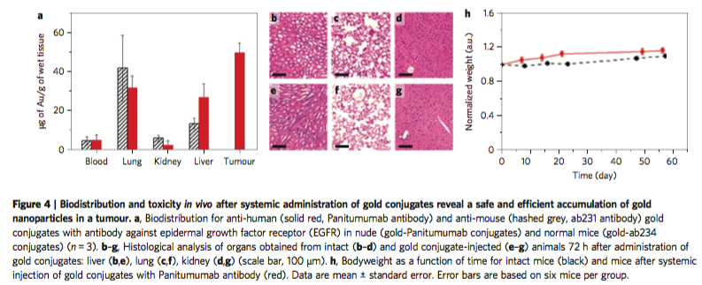 进一步,研究人员将此次试验运用到了动物实际手术操作中。术前24小时,静脉注射抗体处理的胶体金。术前检测,肿瘤组织中金颗粒富集。并且研究人员进行了生物毒性、生物分布等安全性实验,结果喜人。