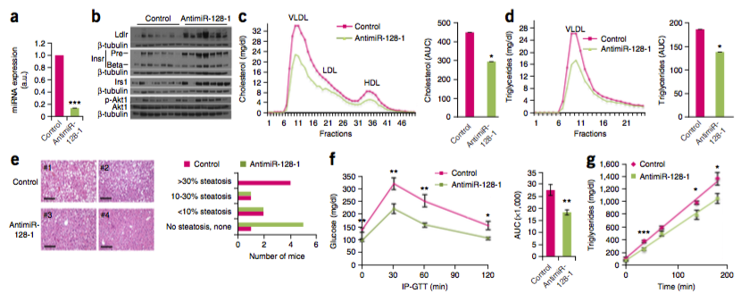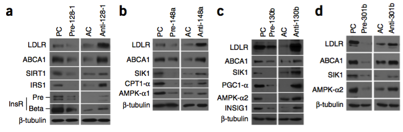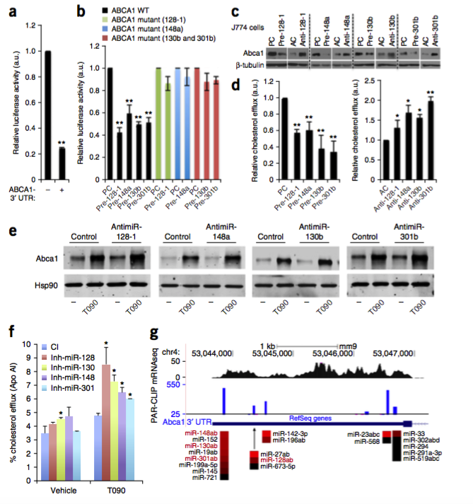 1miR-128-1, miR-148a, miR-130b 和miR-301b这四个miRNAs在脊椎动物体内高度保守并且在许多组织中均有所表达,研究发现这四个miRNAs在脂类体内平衡及脂蛋白运输上起到至关重要的调节作用,其中的靶蛋白包括在肝脏中LDL胆固醇廓清起重要作用的低密度脂蛋白受体LDLR以及在高密度脂蛋白来源、边缘细胞如致动脉粥样硬化的巨噬细胞中胆固醇外流重点干预的ATP结合盒转运体A1(ABCA1)