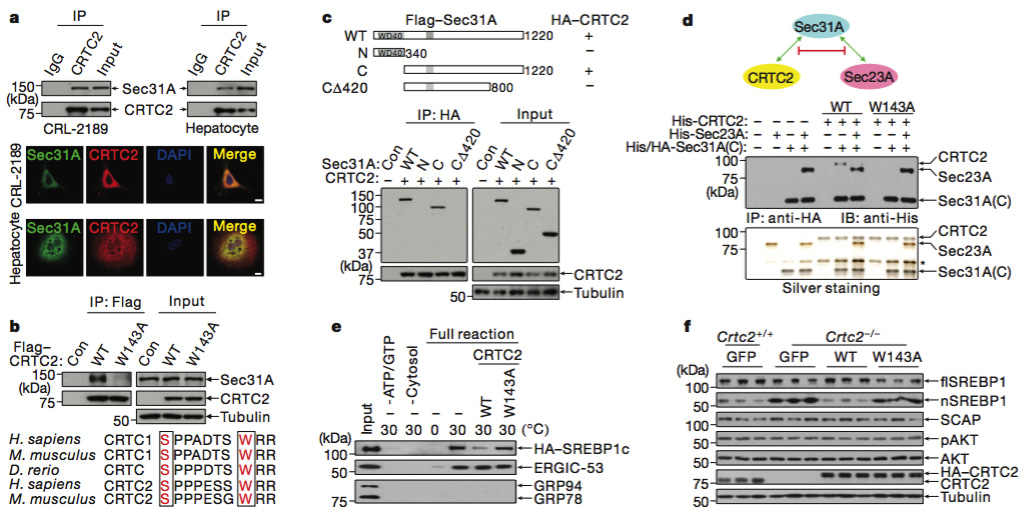 胰岛素信号和营养信号可以调控SREBP1的成熟过程及其转录因子活性, 研究人员推测CRTC2和 Sec31A的相互作用可能受到激素和营养物质的调控, 进而调控了SREBP1的激活。实验证明, 胰岛素和氨基酸均可以减弱CRTC2和Sec31A的相互作用并增强Sec23A和Sec31A的相互作用。