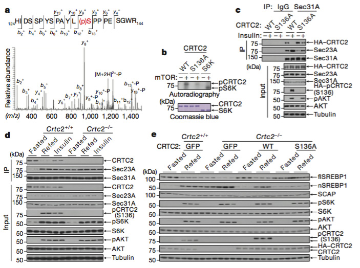 同时,通过体内和体外实验发现, mTOR可以在Ser136这个位点直接磷酸化CRTC2, CRTC2的磷酸化缺陷突变体CRTC2(S136A)减弱了胰岛素对Sec23A:Sec31A之间相互作用的调节。
