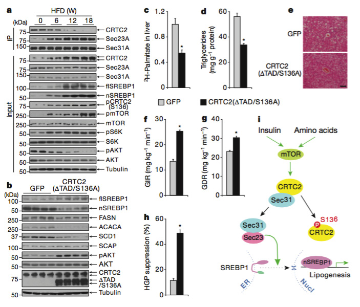 利用肥胖和糖尿病模型小鼠分析了CRTC2的磷酸化及其调控作用。研究结果表明, 在肥胖和糖尿病模型小鼠中, mTOR对CRTC2 Ser136的磷酸化显著增强, CRTC2 和Sec31A的相互作用减弱; 同时, Sec31A和Sec23A 的相互作用增强。另外, 通过表达磷酸化缺陷的 CRTC2突变体CRTC2(ΔTAD/S136A)可以降低高脂食物喂养的小鼠肝脏中SREBP1的活性和甘油三酯的含量、增强小鼠的胰岛素敏感性。