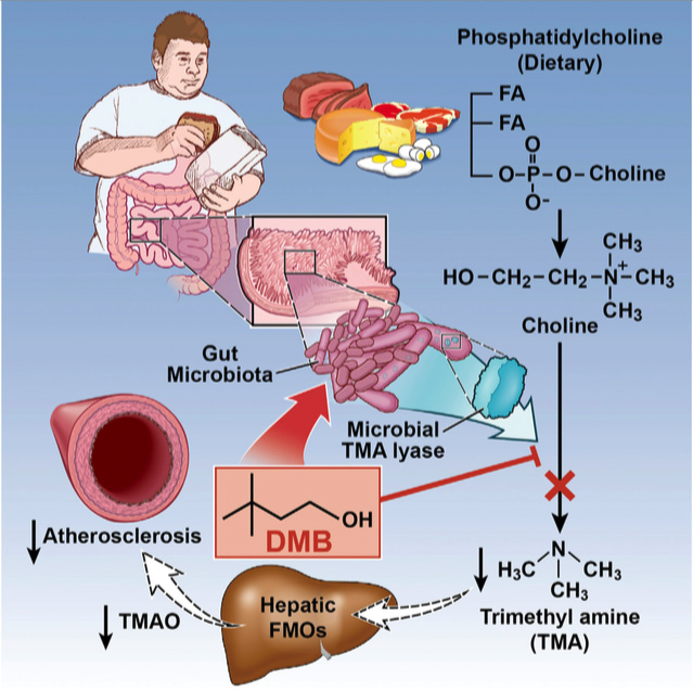 当前研究认为,靶向抑制TMAO产生的第一步,即共生微生物三甲胺(TMA)的产生,就可以帮助抑制饮食诱导的动脉粥样硬化症。