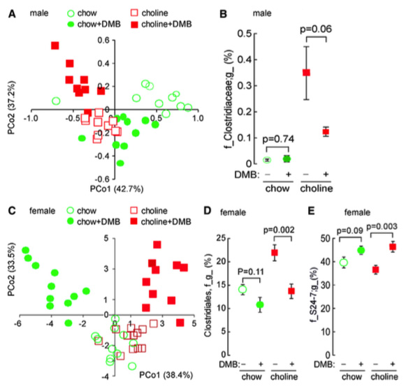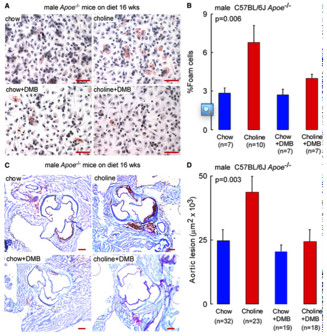 研究人员建立了小鼠动脉硬化模型,并为其提供富含胆碱的饮食。研究显示,DMB治疗能够显著降低小鼠的TMAO水平,抑制动脉斑块形成,并且毫无毒副作用。(天然绿色又健康!)