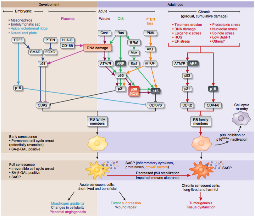 细胞衰老,是细胞响应各种应激增殖,产生永久性阻滞的过程。首先,细胞增殖的过程中,双链染色体端粒逐渐变短,这种DNA损伤反应(DDR)。这种损伤,招募感应装置ATM,激活p53-p21信号通路,阻止细胞进入S期。除此之外,p16也参与细胞衰老进程。