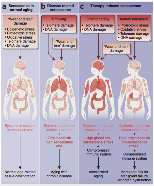 与此相对,慢性细胞衰老对机体是有害的。其诱因是细胞的内源的生长损耗,包括了各种大分子如蛋白质的错误折叠、DNA损伤等。不得不提的是一类外源的压力所导致细胞衰老现象——疾病治疗,所直接导致的细胞衰老。最极端的例子是化疗和放疗。