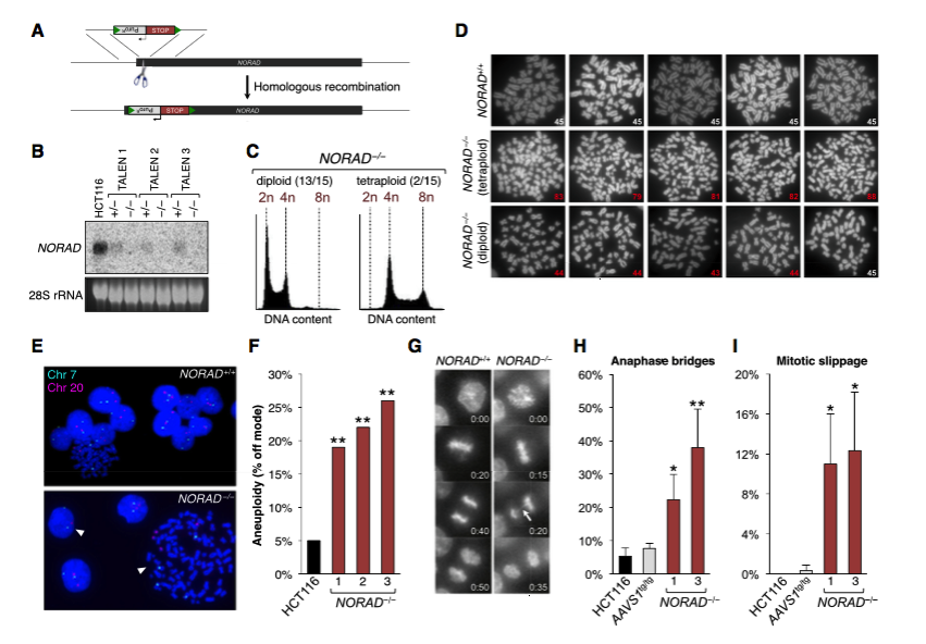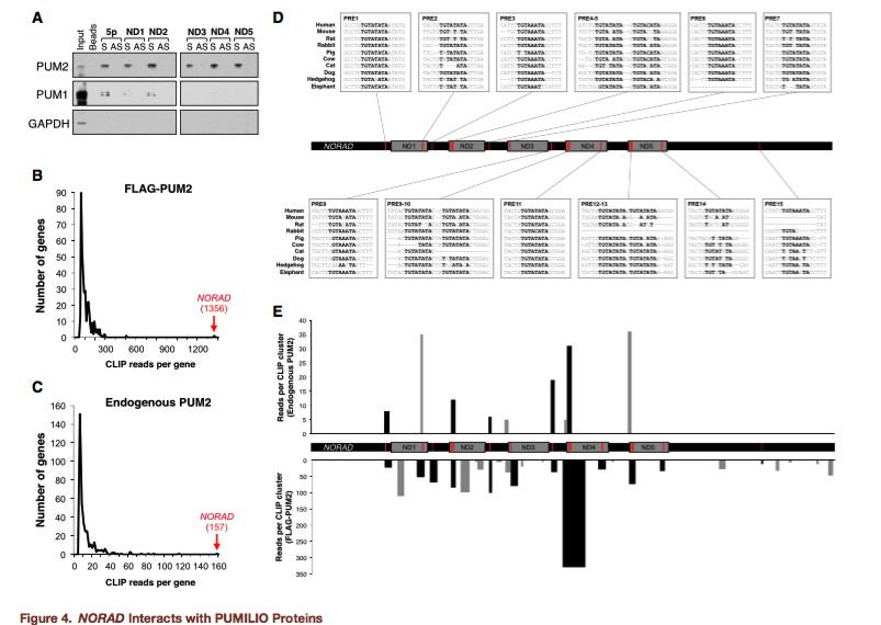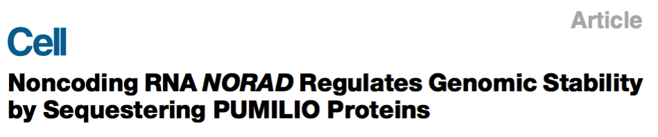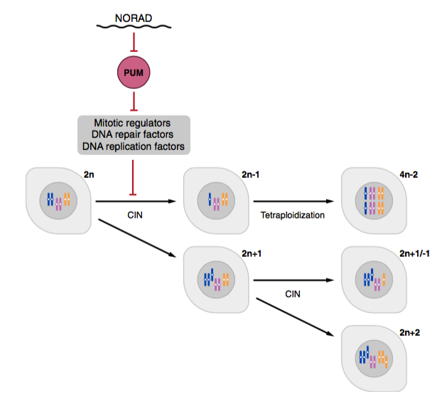 研究人员发现,NORAD,通过螯合PUMILIO蛋白,抑制与其结合的mRNA的稳定性和翻译活性。在NORAD缺失的情况下,PUMILIO蛋白质会异常活跃得抑制有丝分裂、DNA修复以及DNA复制因子等导致染色体的不稳定。