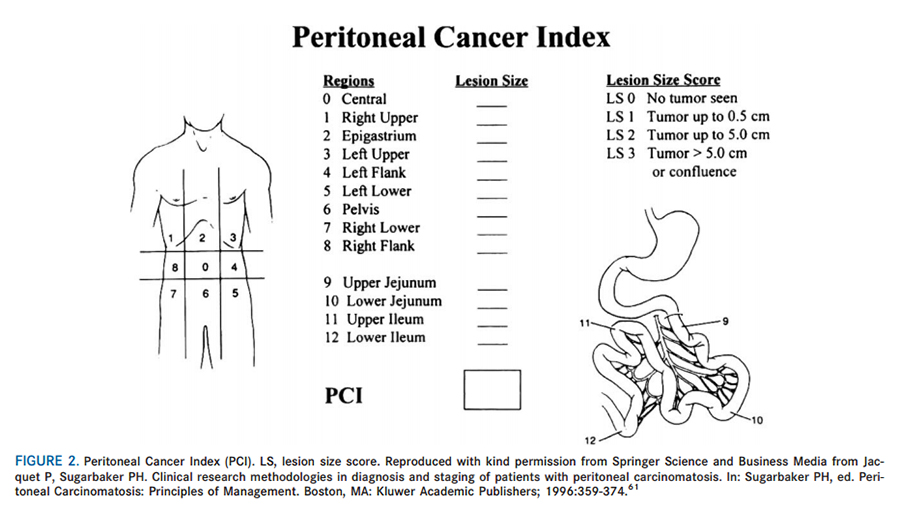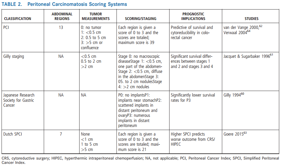 上世纪九十年代,外科肿瘤医师已经研发出腹膜肿瘤的细胞减积术(cytoreductivesurgery,CRS)和灌注化疗(hyperthermicintraperitoneal chemoperfusion ,HIPEC)结合的方法来治疗腹膜转移癌患者。由于使用CRS/ HIPEC治疗方法与患者发病率、死亡率的密切相关性,科学家们付出了很大努力来确定最适用该治疗方法的人群,为了将腹膜转移癌的治疗量化先后不断推出了很多评分系统(如表2所示),其中使用最多的一个量化指数是如图2所示的Peritoneal CancerIndex(PCI)。随后,Esquivel 和Pelz 等人针对结肠癌和阑尾癌也提出了新的评分系统Peritoneal SurfaceDisease Severity Score (PSDSS)。各种评分系统有其相应的计数标准,将众多患者进行了精细的分组。但仅凭这些分数做出判断仍存在局限,为了解决这个问题,Cashin等人基于实验室研究提出了更精确的评分系统Colon and Rectal Peritoneal carcinomatosis(COREP)。为了确认各种评分系统的实际效果,研究者们开展了相应的随机对照实验和回顾性研究,比较了来自结直肠癌的腹膜转移癌患者使用CRS/ HIPEC治疗方法,和单独使用系统性化疗后的存活情况。结果使人兴奋,CRS/ HIPEC组的中值存活期为22个月,而化疗组则仅有12.6个月的中值存活期。另外在为期8年的随访实验中,CRS/ HIPEC组5年存活期比例为20%,高于化疗组的10%。后续的研究提出将CRS/ HIPEC治疗法与化疗结合应用在临床上治疗腹膜转移癌病人的观点,这一方法也得到了诸多学者的验证,Franko和Elias等人先后对此进行了临床比较,结果均表明联合治疗法给腹膜转移癌患者的生存带来了更大的益处。