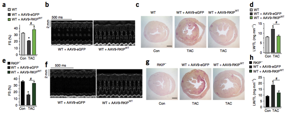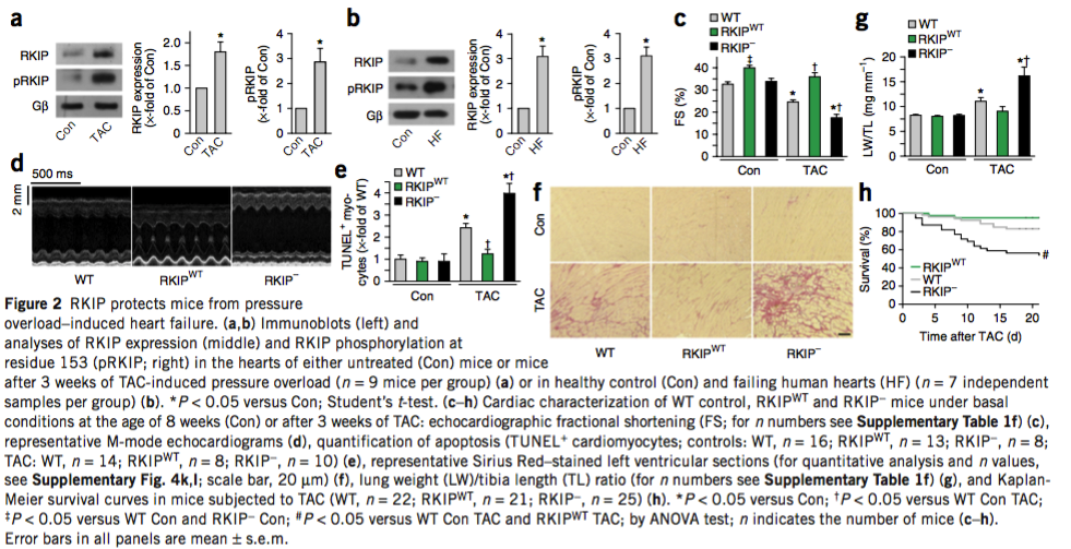 “小鼠中过表达RKIP和野生的小鼠相比,过表达RKIP的小鼠心肌细胞凋亡和间质纤维化减少,同时表明RKIP能够长期增加心脏收缩性但是对心脏没有不利影响。”