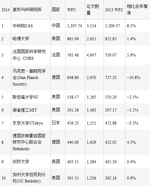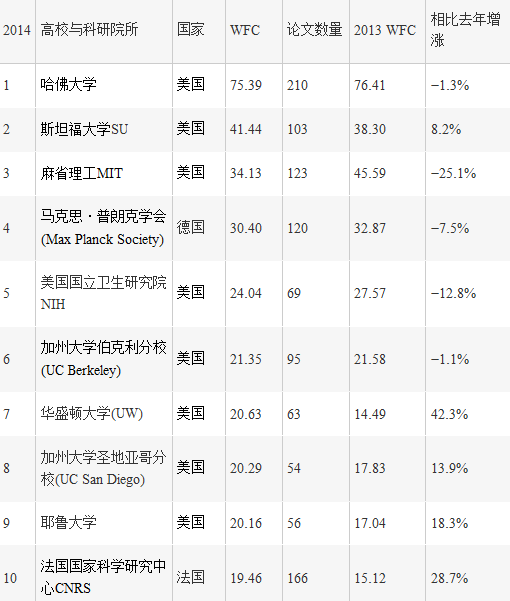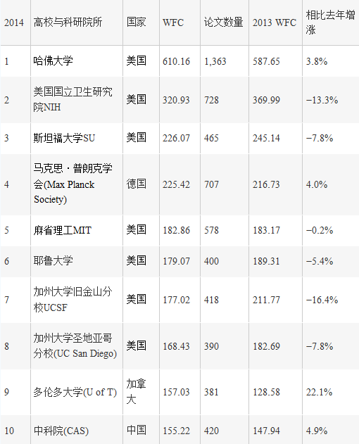 根据在Nature和Science杂志上发表论文的情况,排在世界前十位的高校和科研院所如下表。