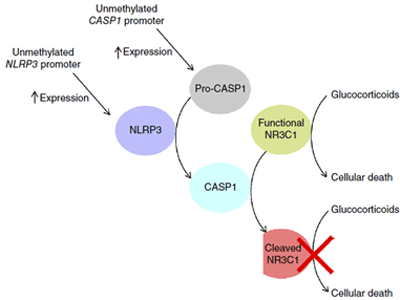 为了阐明糖皮质激素耐药性的机制,Mary V Relling团队选取了444例被新诊断为急性淋巴细胞白血病的患者为研究对象,结果发现:白血病细胞对氢化波尼松(一种糖皮质激素)敏感,并且发现在糖皮质激素耐受的白血病细胞中有很高的CASP1(Caspase1)的表达以及其激活因子 NLRP3的高表达,主要原因是CASP1和NLRP3启动子处甲基化的显著性降低。过表达CASP1导致糖皮质激素受体的剪切,减少了糖皮质激素诱导的转录反应,增加了糖皮质激素的耐受性。敲减或者抑制CASP1显著增加了糖皮质激素受体的水平,并且在CASP1过表达的急性淋巴性白血病能够减缓糖皮质激素的耐受。该研究建立了一个新的机制,NLRP3-CASP1炎症复合体调节糖皮质激素受体的细胞水平,并且降低了细胞对糖皮质激素的敏感性。对糖皮质激素转录反应的广泛影响表明该机制可能调节糖皮质激素在其他疾病上的功能。这一重要研究在线发表在5月4号的《Nature Genetics》上。