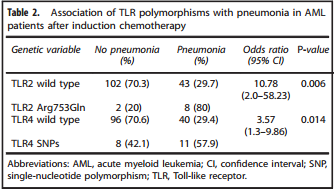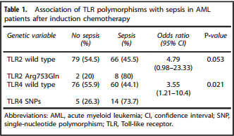 近日,发表在《Genes and Immunity》杂志上的一篇研究,题为“Polymorphisms of Toll-like receptors (TLR2 and TLR4) are associated with the risk of infectious complications in acute myeloid leukemia”,有新的重大发现,即从多态性的toll样受体(TLR2和TLR4)的角度,来重新审视急性髓系白血病感染性并发症。