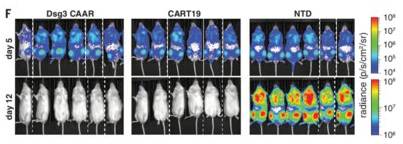 而在这项研究中,作者试图利用CAR-T细胞疗法来治疗一种自身免疫病—寻常天疱疮(pemphigusvulgaris,PV),PV是由自身抗体攻击角质细胞粘接蛋白Dsg3而导致的一种威胁患者生命的自身免疫病。前期研究表明,一种针对CD19分子的CAR-T细胞可通过与CD19+B细胞结合而激活T细胞,造成B细胞的特异性和永久性消除以及白血病的持续缓解,而在PV患者体内,病原性的记忆B细胞可以表达抗Dsg3的受体,因此,作者猜想,经过Dsg3修饰的CAR-T细胞(嵌合自体抗体的受体的T细胞,缩写为CAAR-T细胞)可以通过特异性地结合B细胞上的相应受体,杀伤病原性的自体反应B淋巴细胞,达到治疗PV的目的。由于Dsg3表达为嵌合免疫受体的胞外区域,因此,CAAR-T细胞的毒性只特异性地针对表达有抗Dsg3受体的B细胞,可以靶向治疗PV患者,而不会产生普遍的免疫抑制现象。