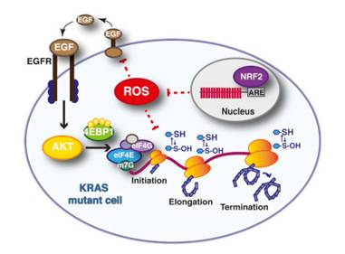 Nrf2也会通过AKT来促进表皮生长因子EGFR的水平。当缺失Nrf2时,正常胰腺细胞中蛋白质合成不受影响;而肿瘤组织中ROS的水平显著升高,细胞增殖速率明显降低。在kras突变的细胞中,很多原癌基因的表达明显上调。例如,在缺失nrf2的 kras 突变的细胞中,介导抗氧化作用的的转录调控因子-Hif1a的表达水平显著下降。