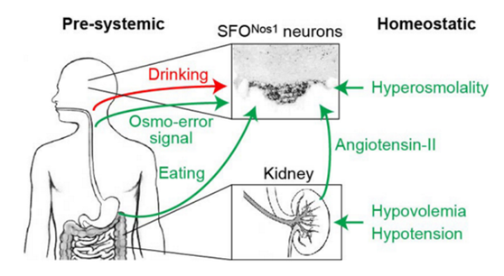 今年发表在nature上的一篇文献就对这一很有意思的问题进行了报道。过去的研究神经系统对于口渴的调节是一个被动的过程,认为由于新陈代谢而导致体内体液平衡被打破时,会引起血液渗透压升高,血管体积以及压力发生改变从而激活口渴相关的脑区,驱动饮水行为的发生。然而,该研究发现口渴相关脑区的调控是一个主动调控过程,它能预期血液内的变化。