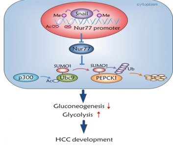 研究中,研究人员首先利用DEN/CCl4和STZ/HFD两种肝癌诱导的小鼠模型(野生型和Nur77敲除型小鼠)发现了Nur77能够显著地抑制肝癌的发生和发展。临床样品检测和统计分析也提示随着肝癌的恶性程度增高,Nur77表达呈明显的下调趋势,且与肝癌患者的预后正相关。在随后的机制研究中通过质谱分析找到了与Nur77相互作用的关键蛋白 -- PEPCK1。PEPCK1是糖异生通路中的一个重要限速酶,在肝癌的发生发展中也发挥抑制作用。但是无论在临床肝癌样品还是体外培养的肝癌细胞中PEPCK1均呈低表达水平,这是由于PEPCK1在124位赖氨酸位点发生了SUMO化修饰,导致蛋白的稳定性降低,并通过泛素-蛋白酶体途径降解。同时,在肝癌中乙酰化酶p300高水平表达,它可以通过乙酰化Ubc9加强其与PEPCK1结合以提高PEPCK1的SUMO化水平,从而促进PEPCK1降解,最终导致糖异生的下调和糖酵解的升高,加速肝癌细胞增殖。然而,Nur77表达不仅抑制了p300对Ubc9的乙酰化,同时也阻断了p300与PEPCK1的结合,从而削弱PEPCK1的SUMO化,稳定其蛋白水平,由此增强糖异生、抑制糖酵解。但是,在肝癌发生发展过程中,由于Nur77启动子发生甲基化,导致其基因和蛋白表达下调,从而无法发挥抑制PEPCK1的 SUMO化及其蛋白降解的功能。所以,抑制PEPCK1 的SUMO化和提高Nur77的表达水平为肝癌治疗提供了一个新方向。