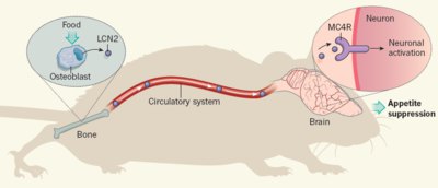 据Mosialou报道,小鼠吃完一餐后,吸收的营养被成骨细胞感知,然后成骨细胞以释放LCN2的方式来应答。LCN2随后经过血液循环流遍周身进入下丘脑,与神经元表面的黑皮质素4受体结合,神经元被MC4R介导的信号通路激活,进而降低食欲。尽管Mosialou等人致力于阐明LCN2与下丘脑中MC4R的结合机制,但这些受体同样也存在于迷走神经遍布后脑与大部分内脏器官,都可以激活神经回路促进厌食。这些迷走神经中的MC4R更易获取循环中的LCN2,因为它们位于血脑屏障之前。因此,可能每天每餐后它们都会被LCN2诱导进而抑制食欲。