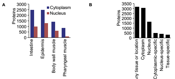 最后,用链霉亲和素柱子纯化被生物素标记的蛋白,进行质谱鉴定,便能获得线虫各组织特异性蛋白质组。相关鉴定结果统计如下。