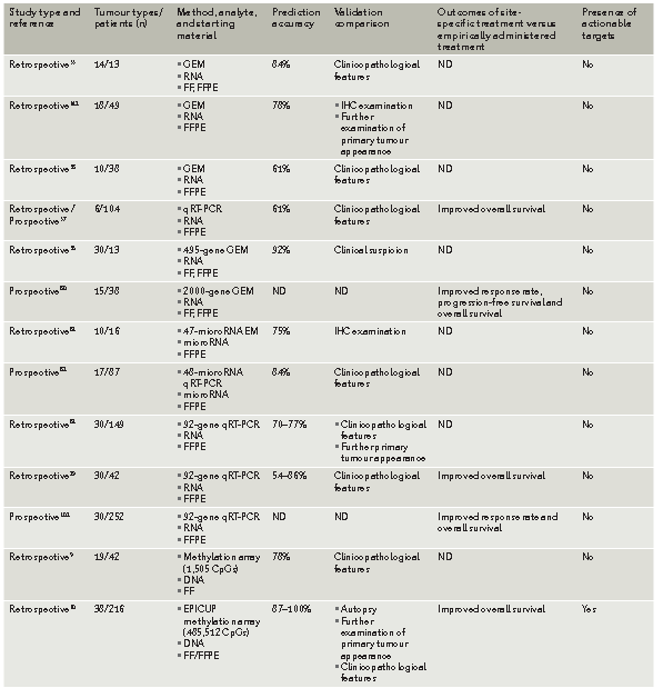 对于CUP的诊断而言,传统的方法(包括免疫组化、核磁共振等)只能够鉴别30% CUP的原发灶位置。近些年,随着精准医疗的发展,一些分子生物学方法逐渐被应用到疾病诊断中。基于基因表达预测的精准医疗方法被应用于CUP的诊断中,能够明显将诊断准确率提升至70%~90%,如下图一所示,但是这一方法仍存在价格昂贵,RNA样本也在手术操作时被破坏等缺点。