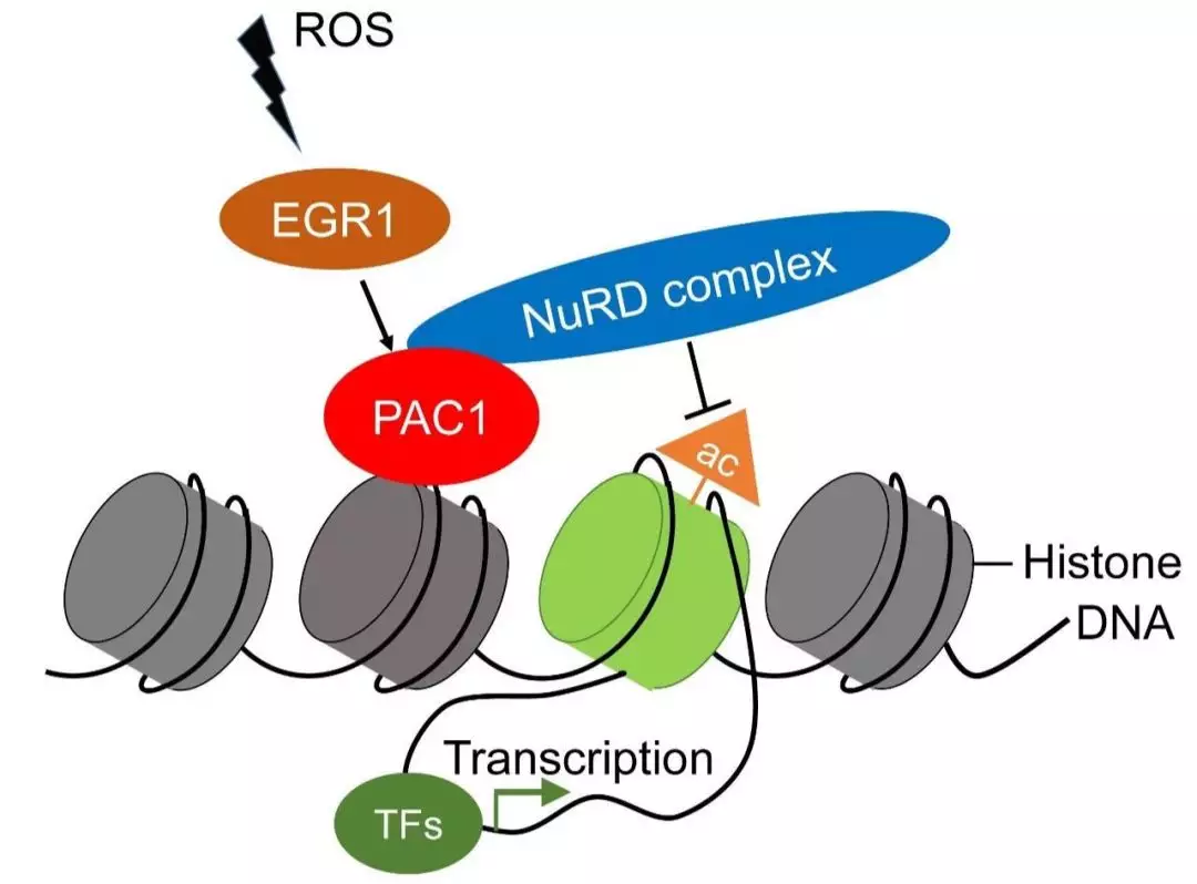 尹玉新团队通过对肿瘤微环境中的炎症因子和代谢物进行系统分析,发现肿瘤产生的超氧化物ROS可以维持周围浸润T淋巴细胞中PAC1基因的高表达。进一步的机制研究显示,ROS通过激活转录因子EGR1而促进PAC1分子的转录和表达。