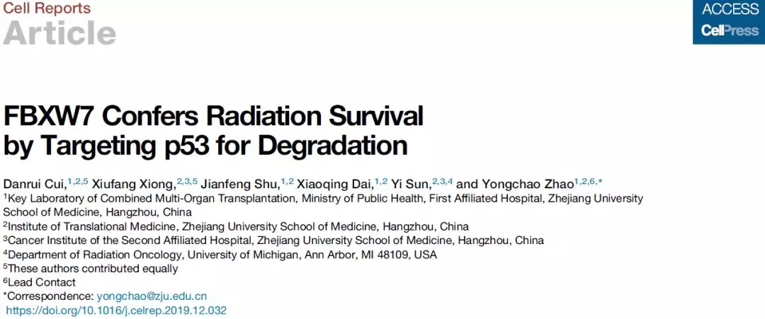 近日,一项发表在《Cell Reports》上来自浙江大学医学院附属第一医院、转化医学研究院赵永超团队的一项研究揭示了泛素连接酶FBXW7通过泛素化降解p53来调控肿瘤细胞放疗敏感性的新机制。