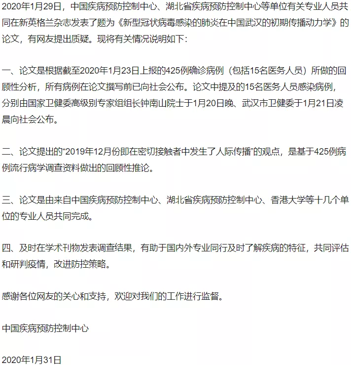 NEJM新论文显示去年12月中旬武汉已发生病毒人传人,中国疾控中心就此回应网友质疑