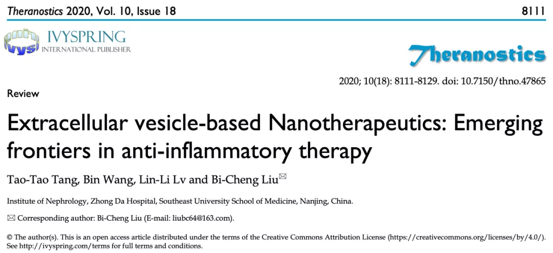 近日,东南大学医学院院长、附属中大医院肾脏内科主任医师刘必成团队在著名生物学期刊《Theranostics》上发表了题为:Extracellular vesicle-based Nanotherapeutics: Emerging frontiers in anti-inflammatory therapy(基于细胞外囊泡的纳米治疗:抗炎治疗中的新兴领域)的综述论文。