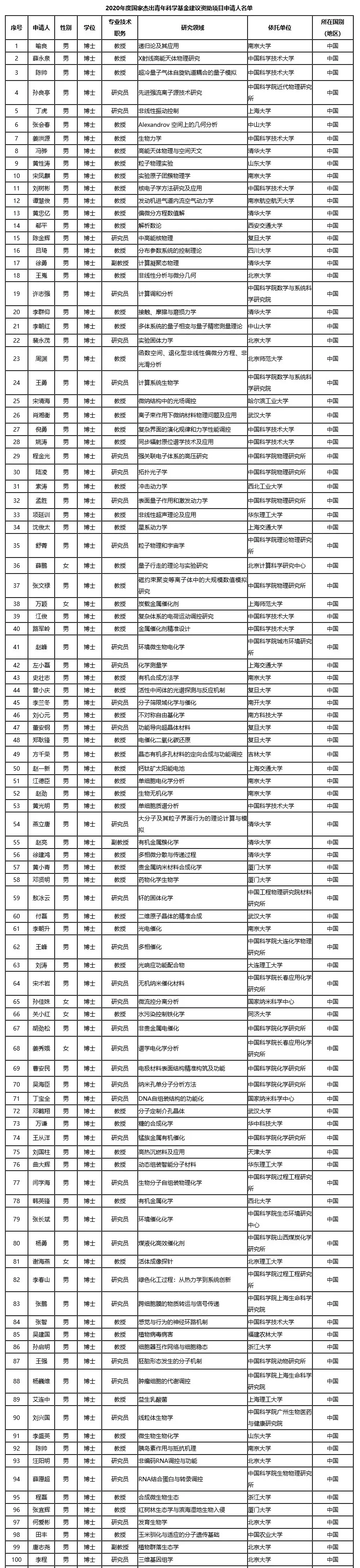 8月11日,国家自然科学基金委员会发布了《2020年度国家杰出青年科学基金建议资助项目申请人名单》。
