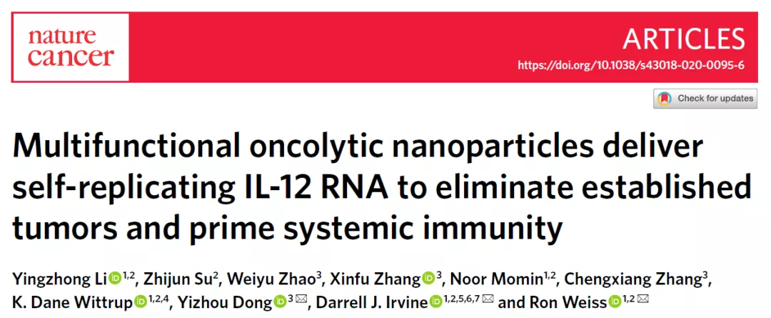 近日,麻省理工生物工程系教授Ron Weiss、材料科学和工程系及生物工程系教授Darrell J. Irvine以及俄亥俄州立大学药学院教授董一洲合作在《Nature Cancer》杂志上发表了题为:Multifunctional oncolytic nanoparticles deliver self-replicating IL-12 RNA to eliminate established tumors and prime systemic immunity 的文章,研究开发了一种新型多功能纳米材料,该材料由脂质体构成纳米结构,包裹着可以自我复制的RNA编码IL-12,临床前期研究表明,该材料可以一针治愈50平方毫米的黑色素瘤和结肠癌,治愈率达到60-80%。
