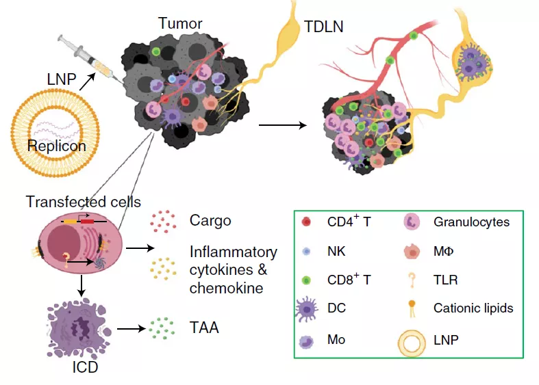 具体而言,该新型材料含由三种关键成分:(1)由脂质体来促进ICD;(2)自我复制RNA激活TLR3信号通路来激发炎症反应,并且进一步协同脂质体来促进癌症细胞的死亡;(3)自我复制RNA编码的IL-12,调节癌症微环境中的免疫细胞,促进抗原提呈细胞提呈由死亡的癌症细胞所释放的癌症抗原,从而诱导内源性抗癌症特异CD8T细胞的激活和分化,进而清除癌症(图1)。