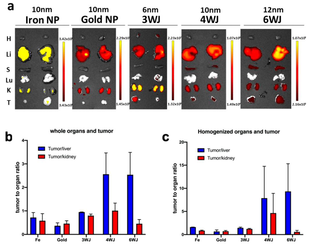 之后通过比较不同纳米颗粒在肿瘤、肾脏、肝脏中的保留时间来证明RNA纳米颗粒的橡胶性质。纳米颗粒由于纳米尺寸而显示出EPR效果,为了定量研究这种特性,研究者定量比较了RNA纳米颗粒与固体无极纳米结构的肿瘤吸收、器官保留和肾脏清除率。将RNA纳米颗粒和金、铁纳米颗粒对小鼠进行静脉注射,8h后发现他们在肿瘤的保留方面出现很大差异,通过对比可以看出RNA纳米粒子具有更高的肿瘤与肝脏和肿瘤与肾脏比率,均质器官的样品数据与离体结果一致,这些结果支持了RNA纳米颗粒的类橡胶性质的假设,并导致更强的EPR效应。