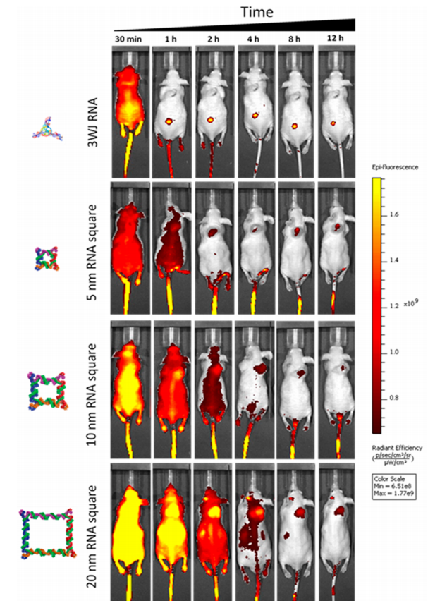 为了进一步确认RNA纳米颗粒在肾脏排泄中的橡胶性质,文中对小鼠注射入了不同大小的纳米颗粒,并收集小鼠尿液进行研究。肾脏排泄的上限为5.5nm,注射0.5h后收集尿液用PAGE检测,可以看到完整的RNA纳米颗粒,但是纳米颗粒的尺寸要大于肾脏排泄的尺寸,这表明RNA纳米颗粒可能会调整其形状以适应并穿过滤缝,并在经过后像橡胶一样恢复其原始结构。
