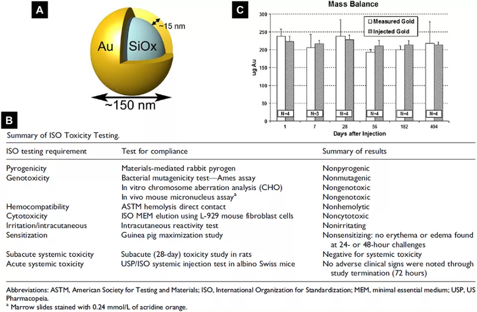 作者以三个脂质体成功案例为切入口,即DOXIL(阿霉素脂质体)、ONIVYDE(伊立替康脂质体)和 VYXEOS(阿糖胞苷/柔红霉素定比载药脂质体),着重阐述了其中涉及的安全性问题。脂质体包裹后的化疗药与小分子药物安全性数据明显不同,主要体现在毒作用机制、临床不良反应事件上。继而对新兴的纳米材料和肿瘤药物载体的生物安全性评价进行了归纳,重点讨论已经获得IND(Investigational New Drug)或进入早期临床研究(如纳米金壳AuroShell)等体系的安全性数据。