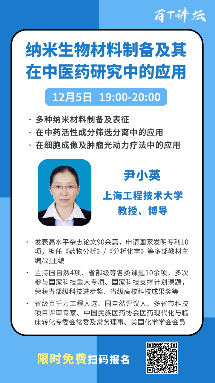 本周六晚七点,上海工程技术大学尹小英教授为您带来《纳米生物材料制备及其在中医药研究中的应用》专题讲座,就多种纳米材料制备及表征、纳米生物材料在中药活性成分筛选分离、细胞成像及肿瘤光动力疗法中的应用等展开详细介绍,从纳米生物材料角度为活性药物分离、肿瘤诊疗等研究提供新思路!诚邀中医药、肿瘤诊疗等研究领域,对纳米生物材料感兴趣的科研工作者参与!