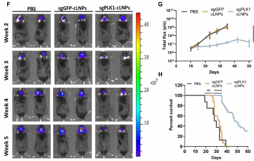脑内注射CRISPR-LNP后,胶质母细胞瘤的生长得到了显著抑制,动物生存时间延长