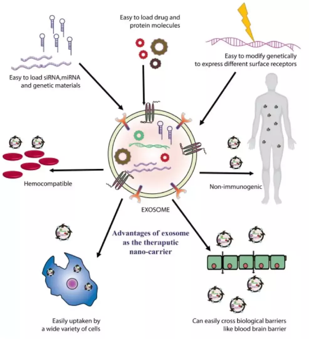 外泌体最有用的特性之一是它们穿过屏障(如细胞质膜和血/脑屏障)的能力,此外,由于其天然的材料运输特性、固有的长期循环能力和出色的生物相容性,外泌体具有很大的潜力成为药物递送载体,适用于递送各种化学物质、蛋白质、核酸和基因治疗剂。