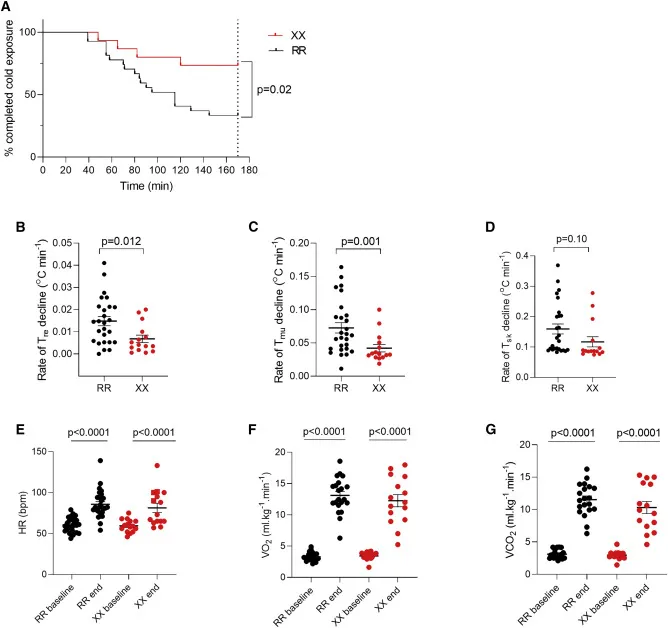 为了验证这一想法,研究人员招募了42名18~40岁携带ACTN3 LOF变体或ACTN3功能正常的健康成年男性在14℃的水中分段浸泡120分钟。69%携带ACTN3 LOF变体的受试者能在浸泡冷水时将体温保持在35.5℃以上,而ACTN3功能正常的受试者中只有30%能做到这一点。平均而言,α-actinin-3蛋白的缺失会使直肠和小腿肌肉的降温速度减慢一半。
