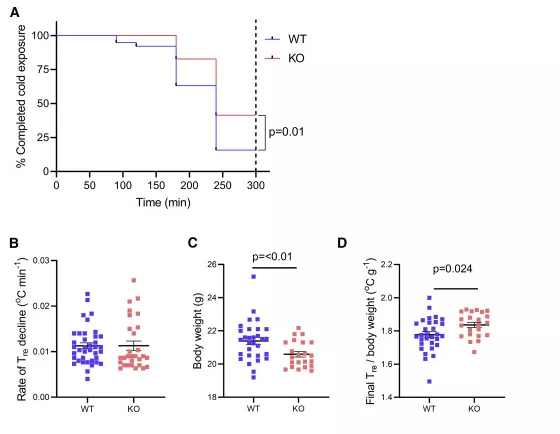 随后,研究人员通过直肠探针测量小鼠核心体温,发现Actn3 KO小鼠在冷暴露期间保持体温高于35.5°C的数量明显高于WT小鼠,这进一步说明了α-actinin-3基因缺失可以提高小鼠耐寒性。
